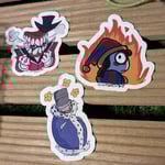 TADC stickers based off of an angry Caine, Pomni, and a blissful Kinger!